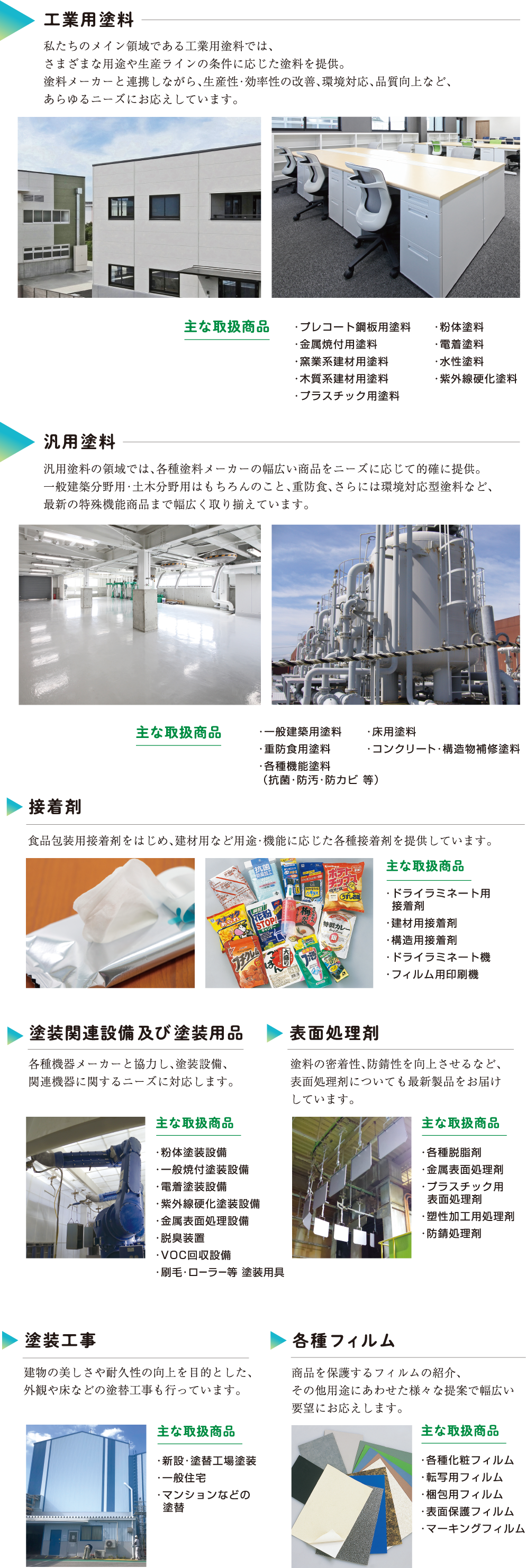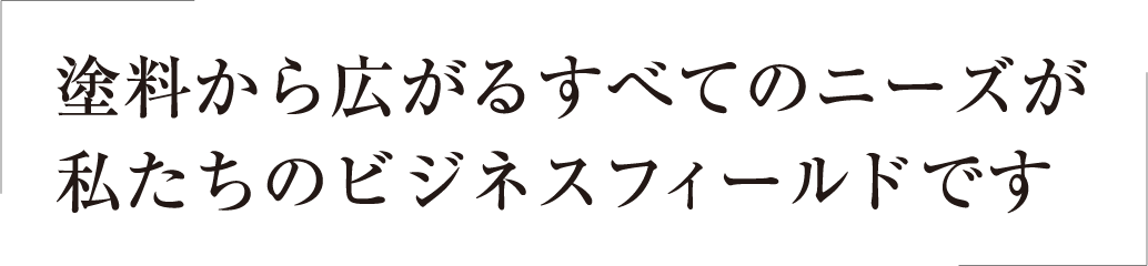 様々な分野の塗料をお届けする専門商社として、変化する時代のニーズに応え続けてきた私たち。なかでも工業用塗料の販売においては、美観・保護の役割はもちろんのこと、環境配慮型塗料・機能性塗料にも対応し、業界トップクラスの実績を誇っています。また、ユーザーの方々のご要望に応えるために、塗装関連設備、表面処理剤、接着剤等、塗料の周辺分野にも進出。塗料から広がるすべてのフィールドに限りない可能性を描いています。